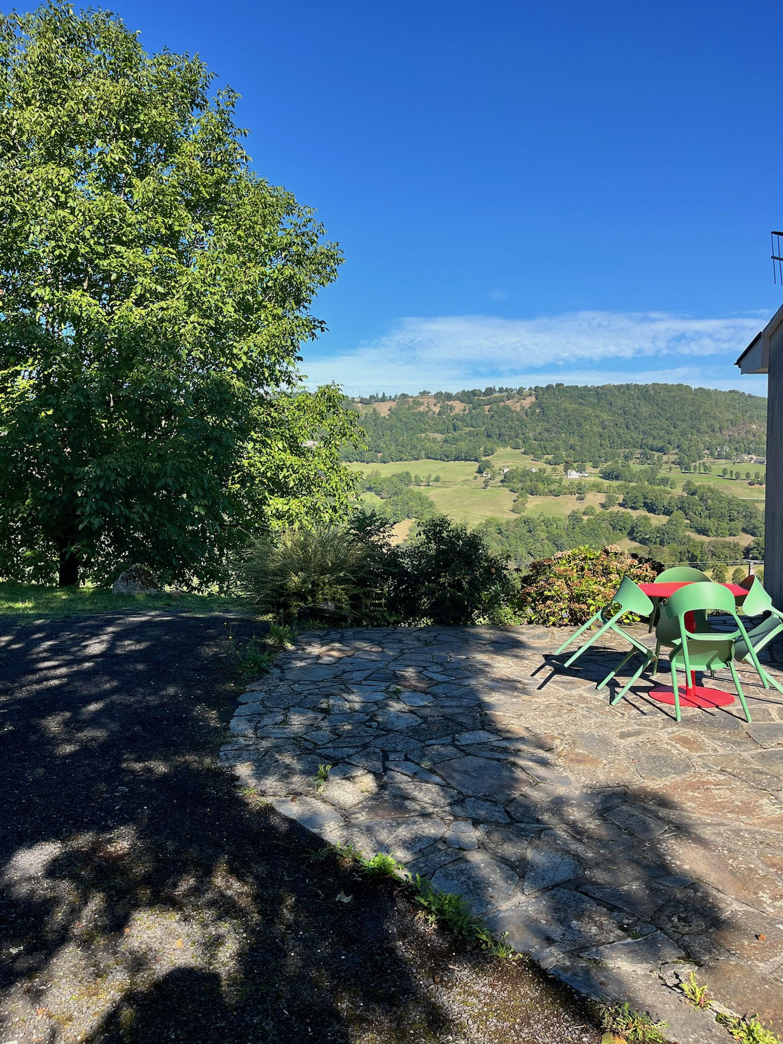Terrasse à 360° avec vue sur le jardin, vue sur la Vallée du Goul et les monts du Cantal